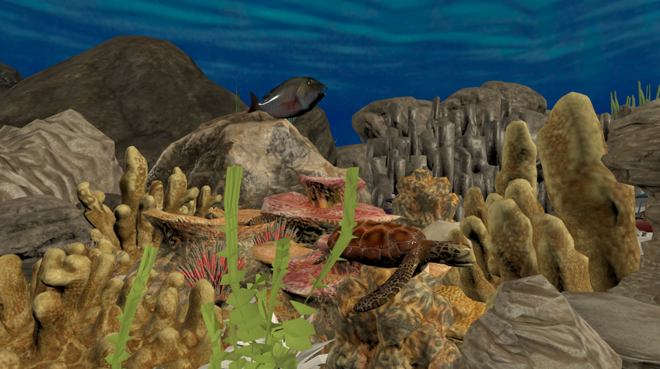 使用者戴著VR頭盔,使用雙手向前游動,在虛擬的海底世界中,尋找寶藏,觀看魚群。